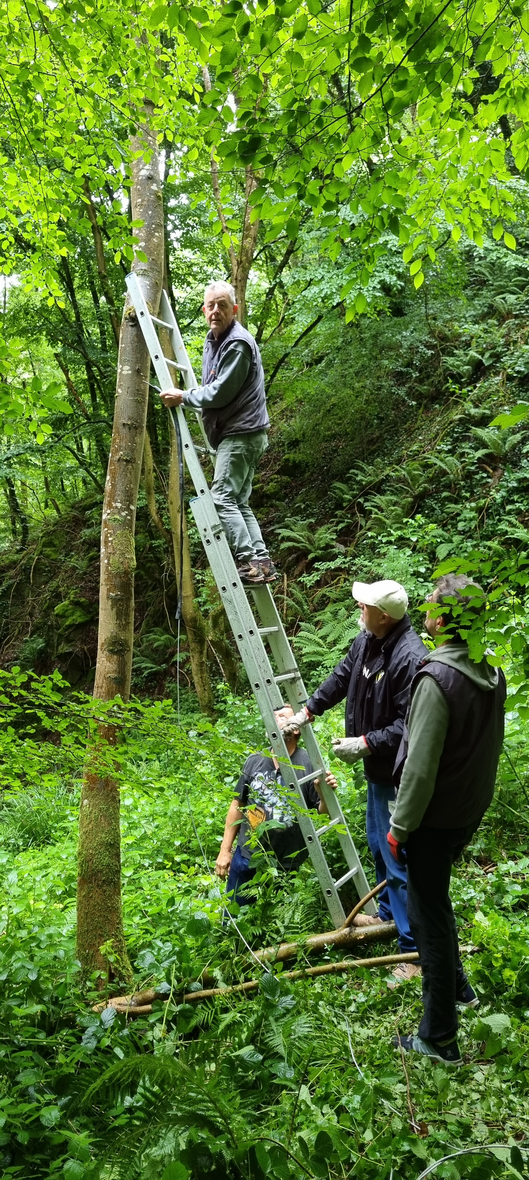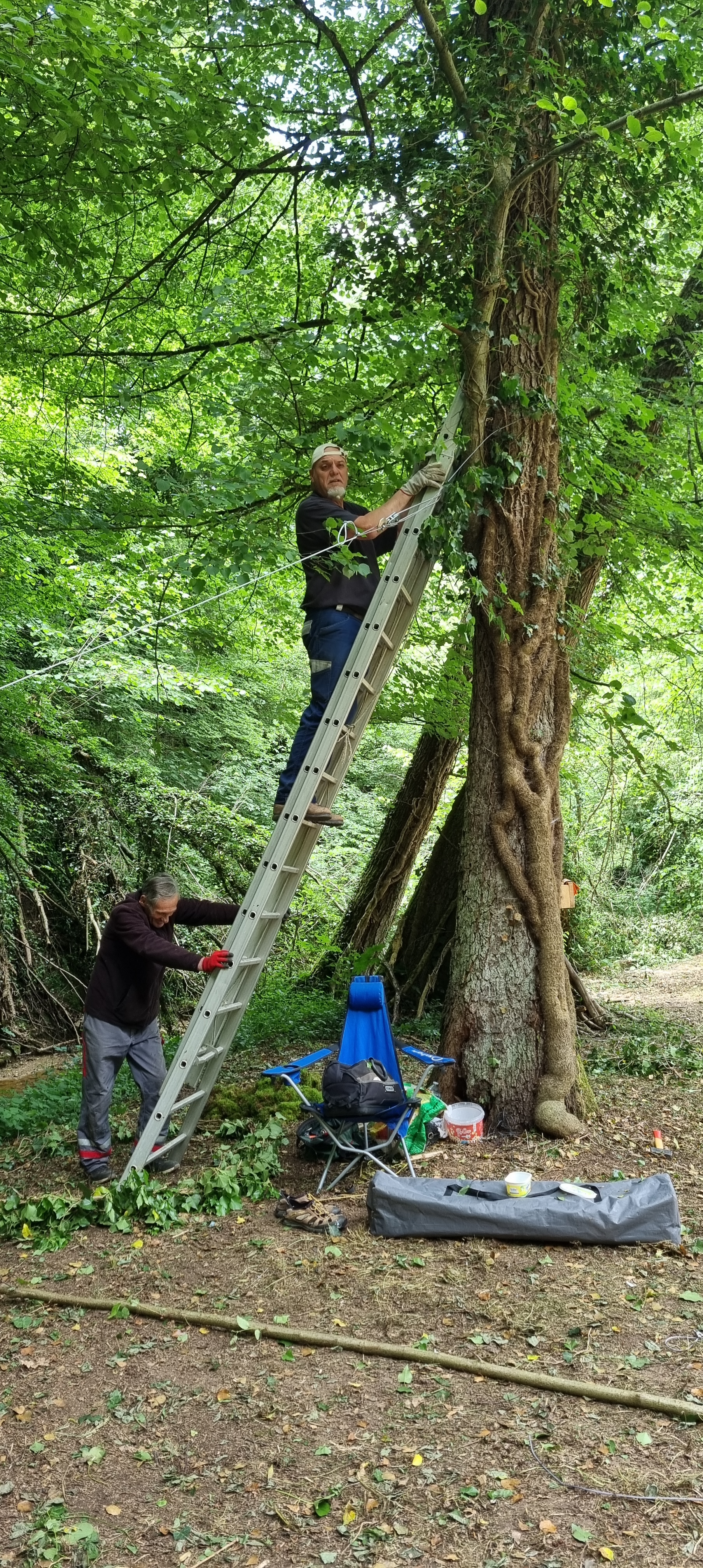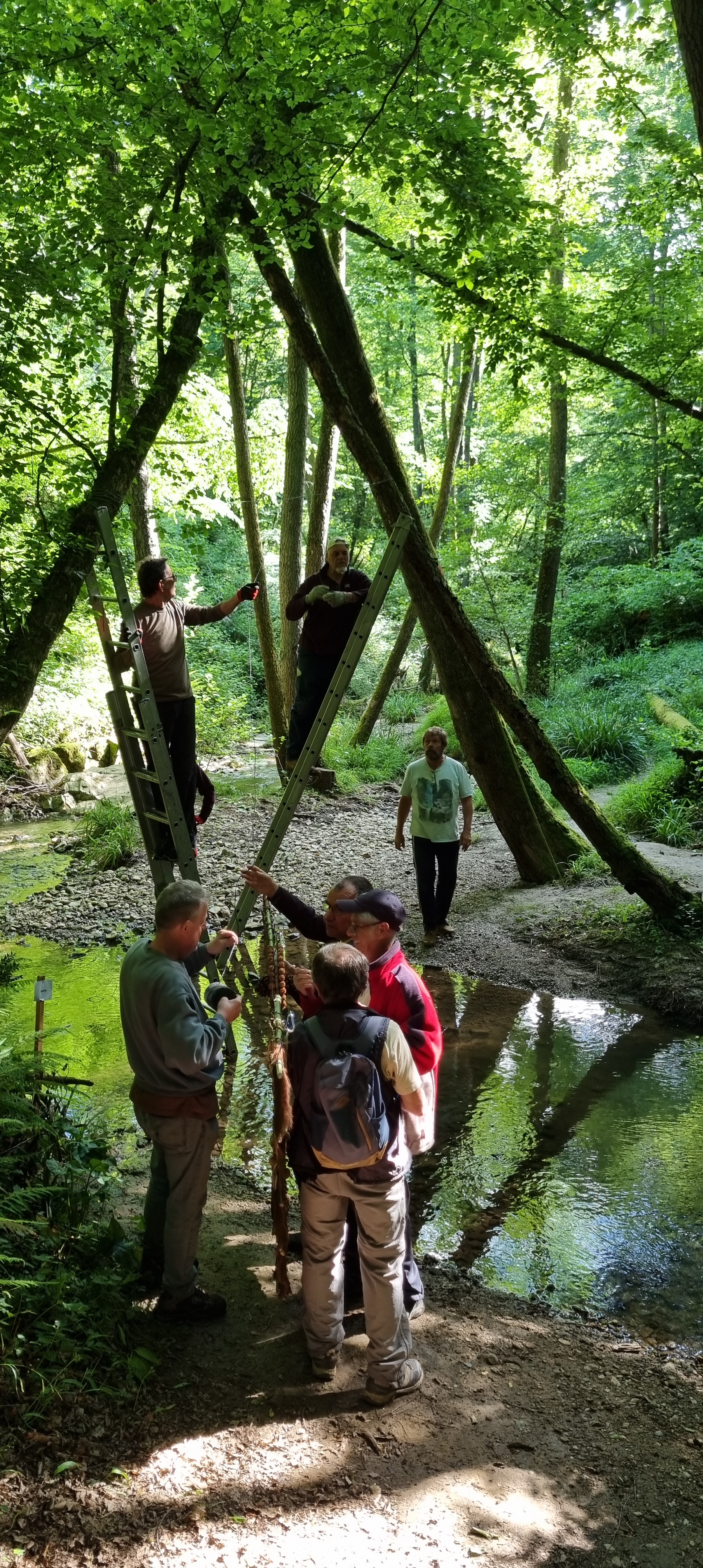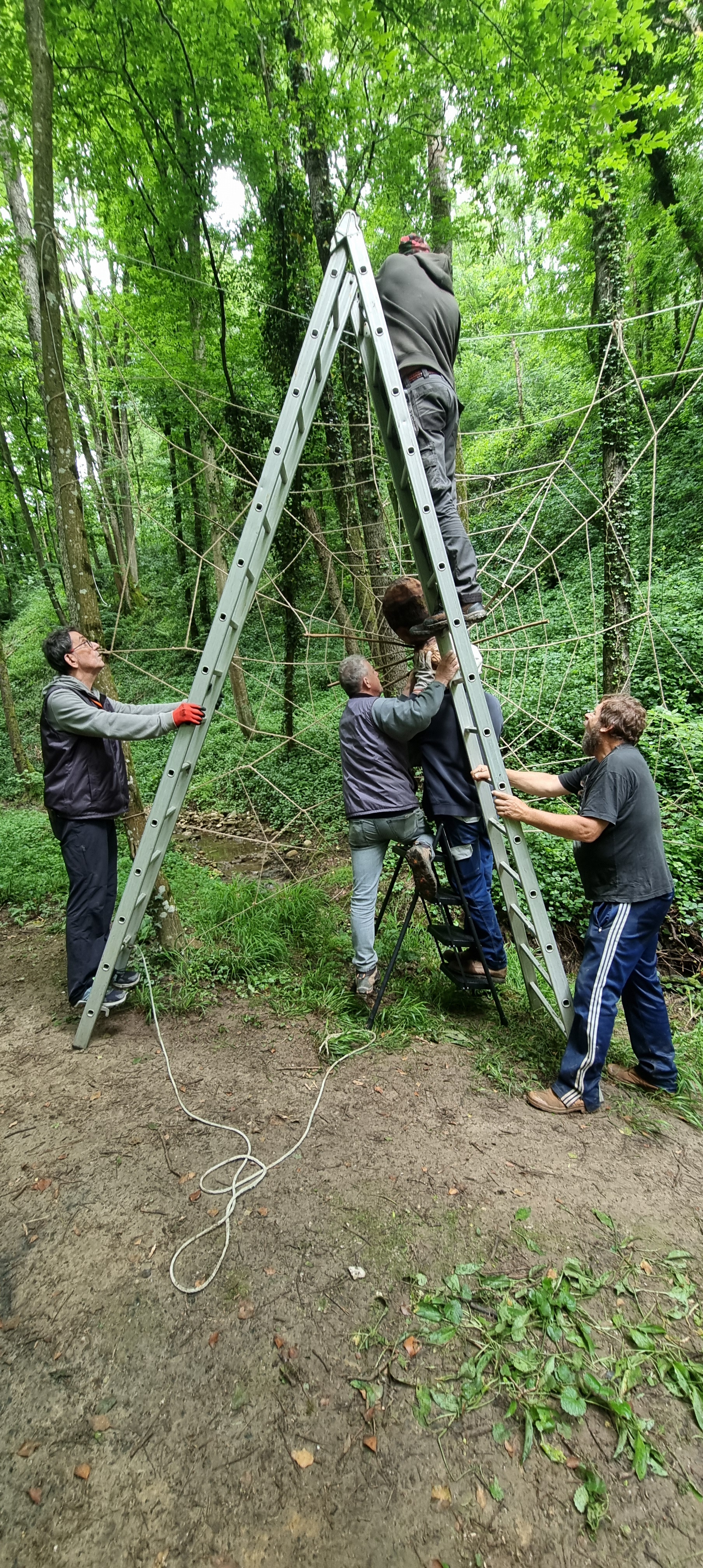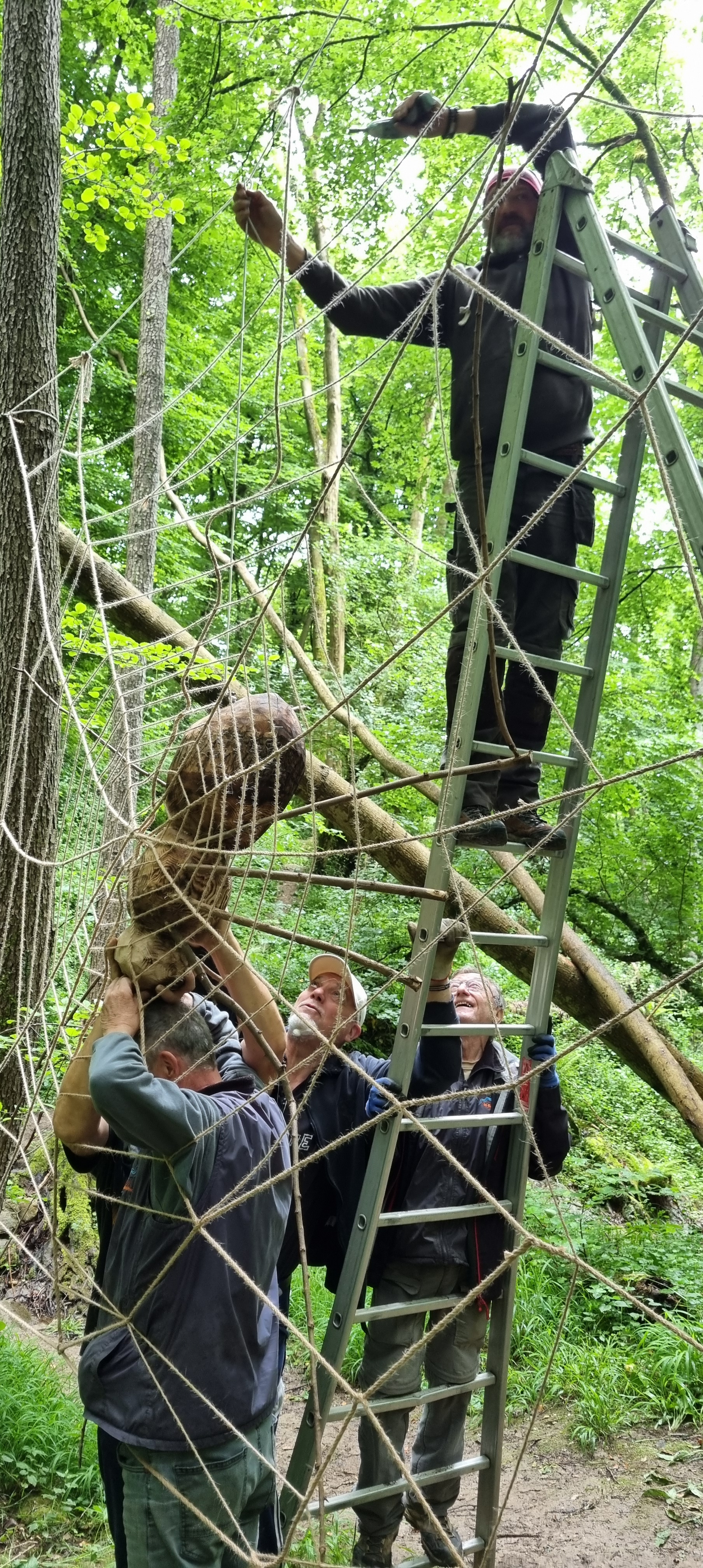 Découvrez en images les différentes étapes de fixation des câbles qui suspendent une grande partie des œuvres du Sentier Art & Nature Le Gorneton. Si les œuvres relèvent de l’art, être en équilibre sur une échelle pour les installer en est un autre !