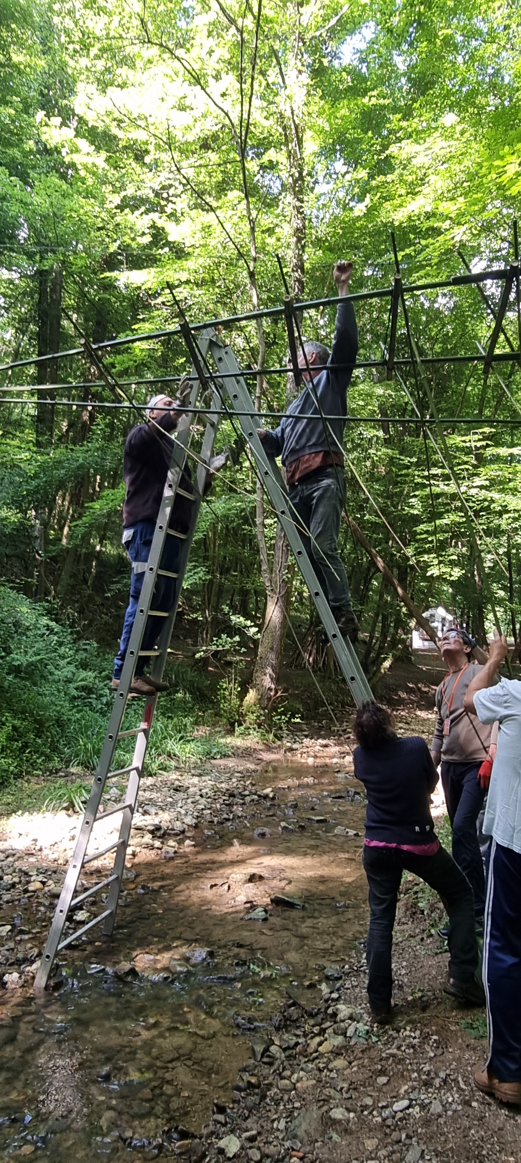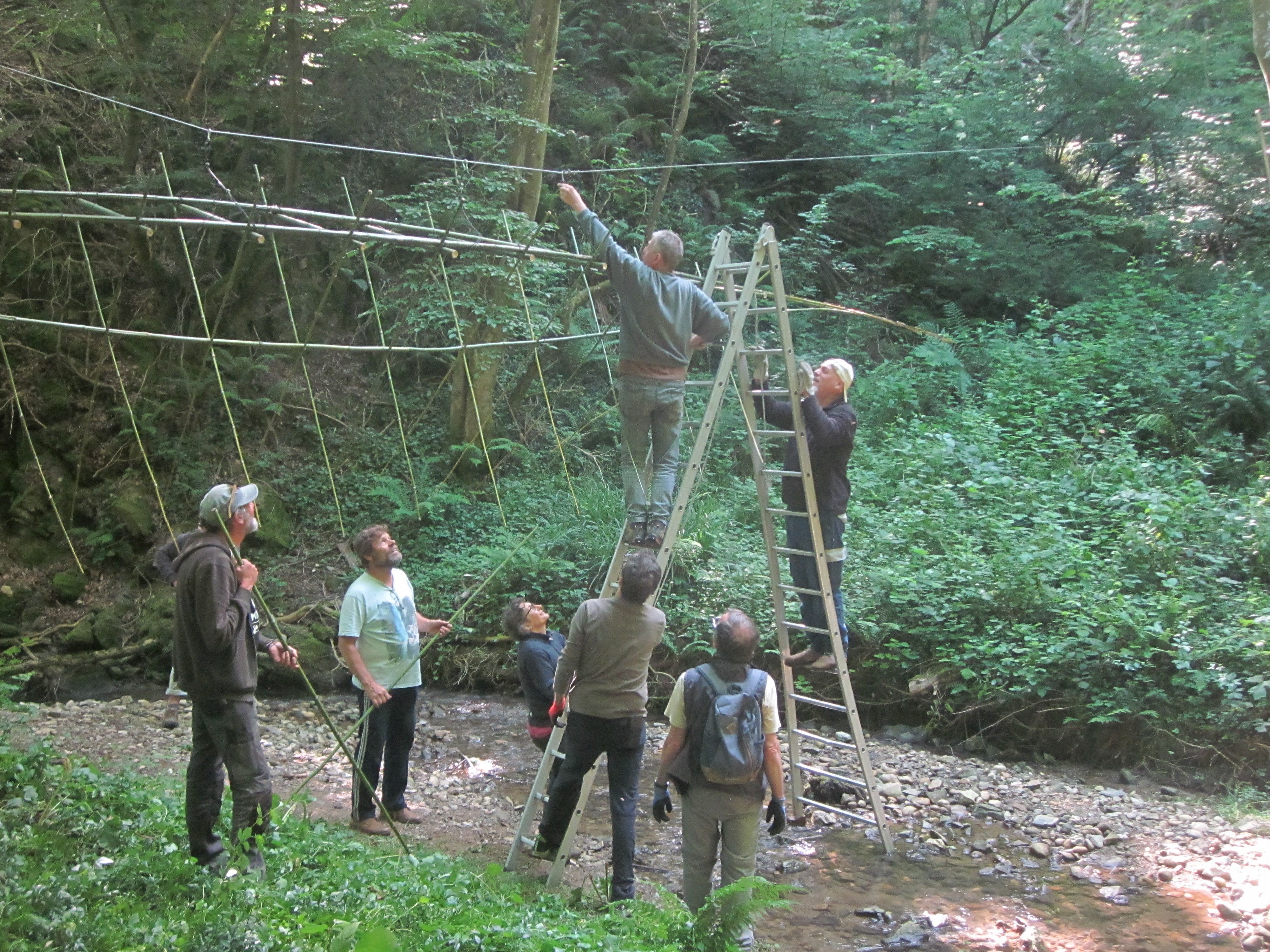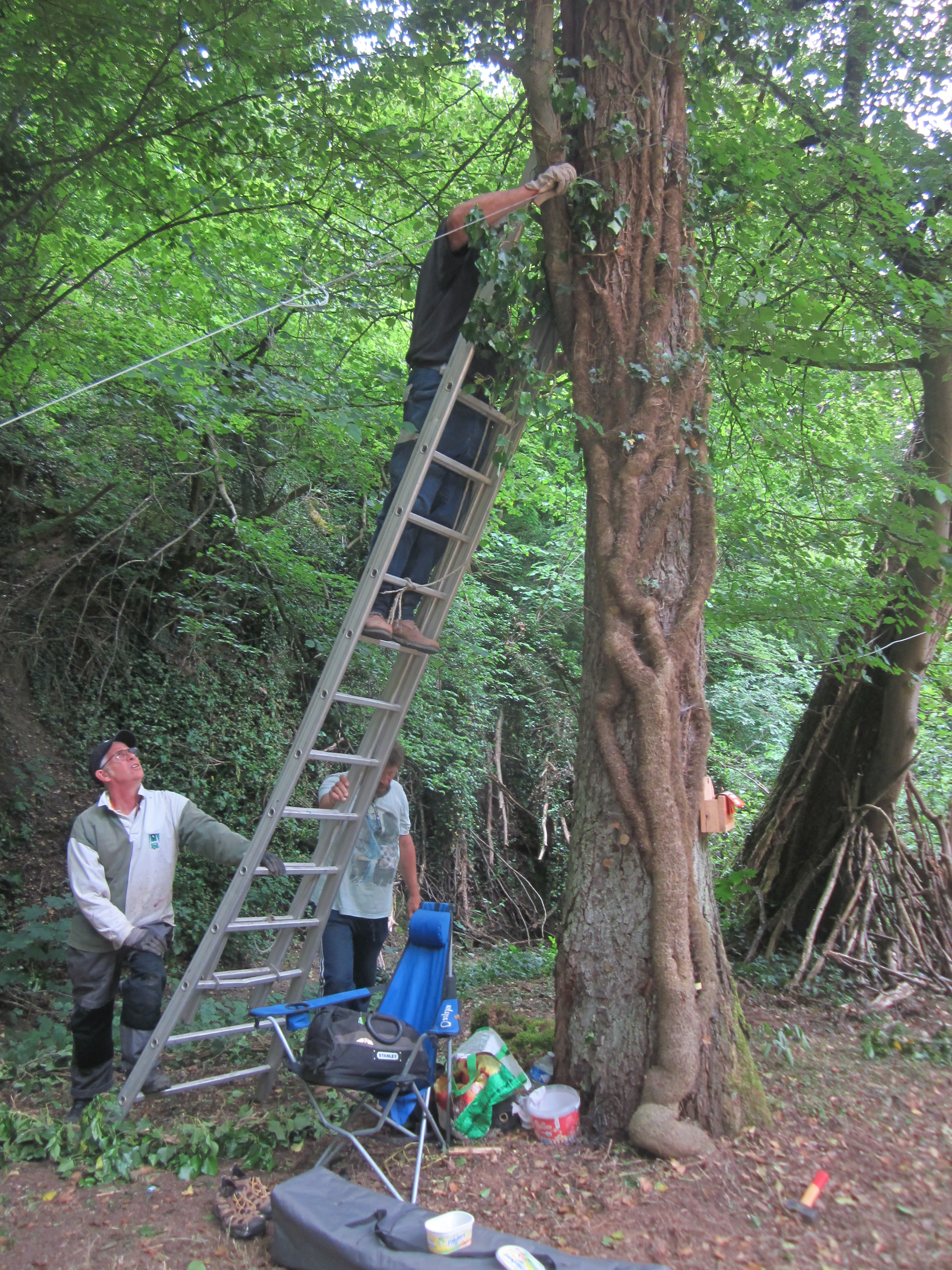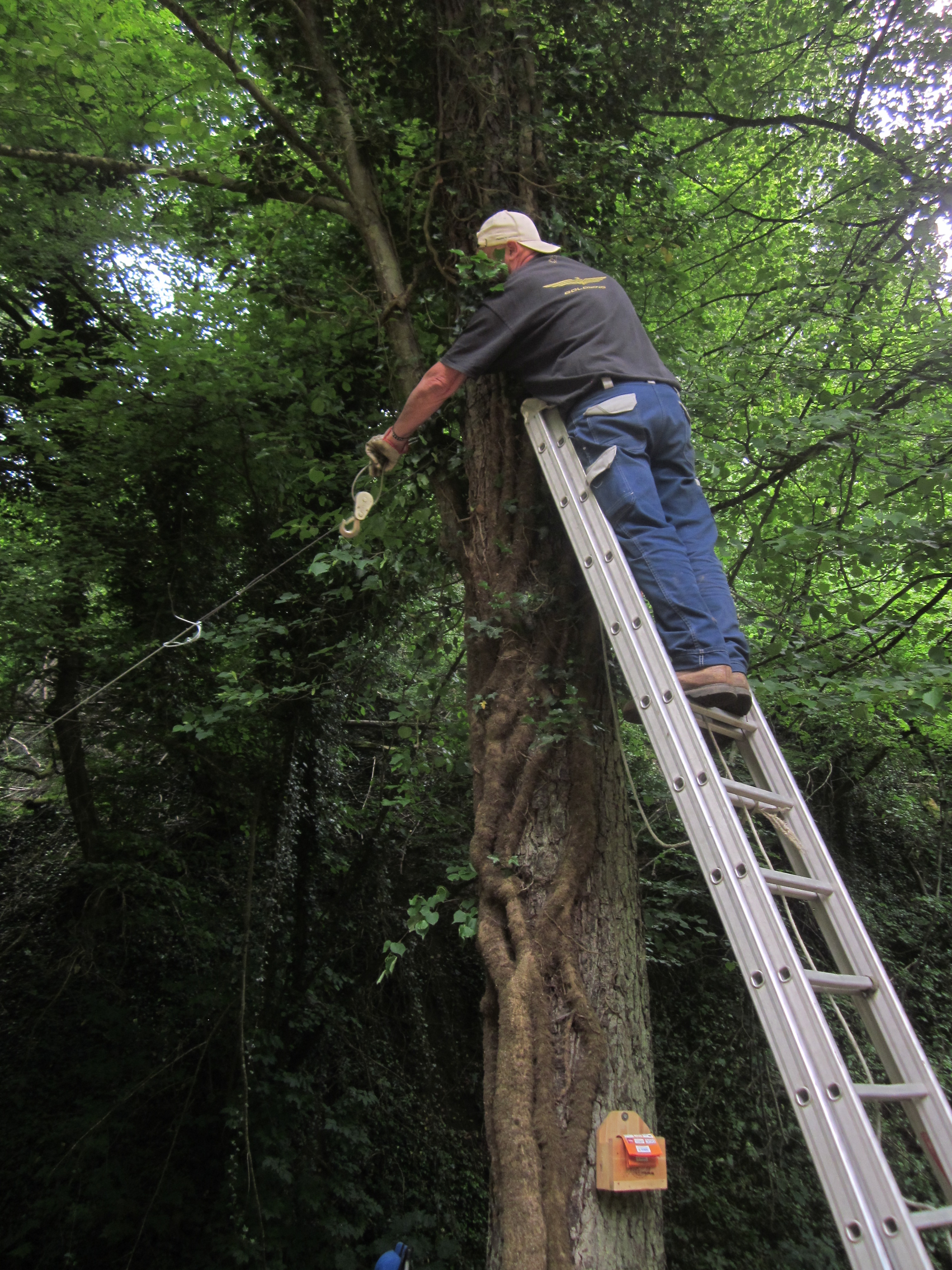 Découvrez en images les différentes étapes de fixation des câbles qui suspendent une grande partie des œuvres du Sentier Art & Nature Le Gorneton. Si les œuvres relèvent de l’art, être en équilibre sur une échelle pour les installer en est un autre !