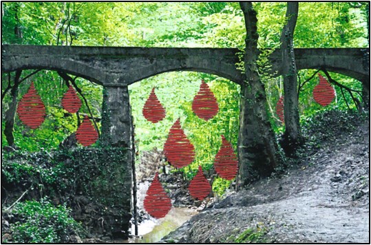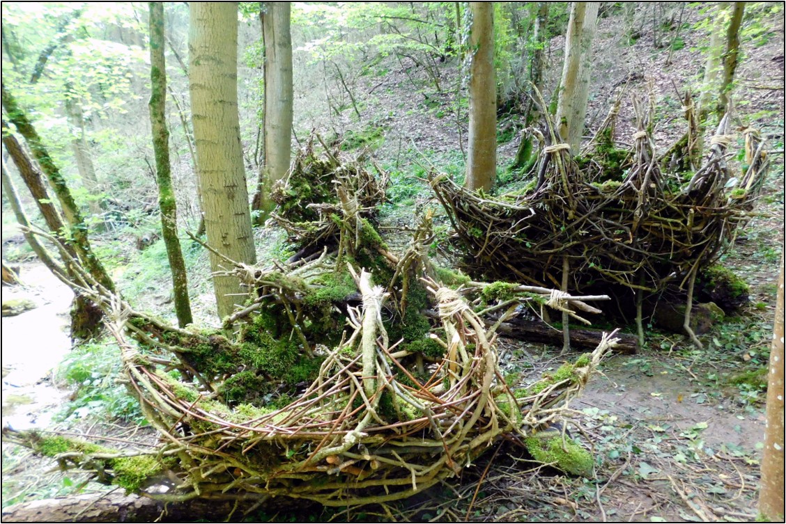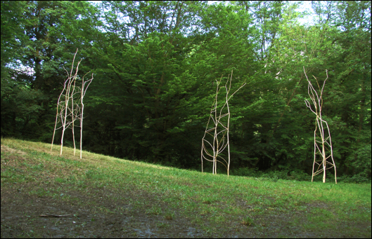 Si on s’approche, on peut percevoir que les objets sont fabriqués d’une multitude de branches et sont arrangés l’un à côté de l’autre. Ils sont fait du matériau de la forêt et ils sont transparents, de cette manière, on peut voir les environs aux travers des branches.