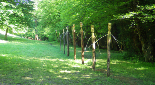 poteaux dressés comme les représentations divines de l’Antiquité. Seuls, les visages sont sculptés, leurs bras sont faits de branches. Ils cheminent imperturbables sur les sentiers du Gorneton. Ils peuvent être installés en file indienne, ou un peu partout séparément tout au long du chemin comme des sentinelles solitaires.